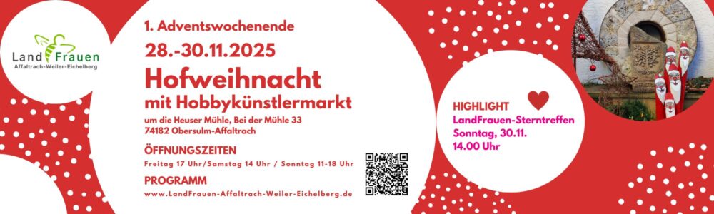 Rund um die Heuser Mühle in Affaltrach laden wir Sie zu unserer schönen Hofweihnacht 2025 ein. Leckeres Essen, heiße Getränke und schönste Stände von über 20 privaten Hobbykünstler/-innen aus der Region werden angeboten.